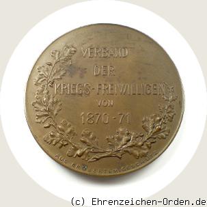 Diese Medaille wurde vom Verband der Kriegsfreiwilligen 1870/71 im Jahr 1902 gestiftet. Kaiser Wilhelm II. genehmigte am 29. Dezember 1902, per allerhöchsten Erlass, daß dem Verband zur Herstellung die erforderliche Bronze aus dem Bestand der Militärverwaltung zur Verfügung gestellt wird. Die Kosten wurden aus dem Dispositionsfond bei der Generalstaatskasse beglichen. Die Fertigung zog sich offenbar bis 1905 hin. Der Entwurf stammt von A.M. Wolff. Die Fertigung übernahm die Firma Werner & Söhne in Berlin. Der Verband gründete sich 1897 und hatte 1902 ca. 1600 Mitglieder. Vorsitzender war Land-Bauinspektor Wulff aus Lankwitz (heute Berlin). Der Verband hatte Ortsgruppen in Berlin, Herfort, Hamburg, Hannover, Karlsruhe, Mannheim, Königsberg, München, Münster, Ulm, Kölln-Bonn, Posen und Danzig. Das Jahresfest wurde jeweils am 22. März, dem Kaisergeburtstag, durchgeführt. Zweck des Bundes war die Freiwilligen in nähere Beziehung zu einander zu bringen, Pflege des Andenkens, alte Waffenbruderschaft zu erneuern, Liebe zu Kaiser und Reich sowie die Stärkung des Selbstbewusstseins und Einigkeit des deutschen Volkes. Jahresbeitrag waren 3 Mark. Der Verband gab die „Mittheilungen“ als Verbandsorgan heraus. Aufgenommen wurden nur Freiwillige des Krieges 1870/71 die im Besitz der bronzenen Kriegs-Denkmünze für 1870/71, Kämpfer, waren. Neben der kämpfenden Truppe konnten auch Feldgeistliche, Sanitäter, Johanniter, Malteser und Beamte aufgenommen werden sofern sie sich freiwillig gemeldet haben. Quelle: Deutsche Reichsanzeiger 5.12.1898, 23.03.1903, 08.03.1911 und Mitgliedsausweis des Verbandes.