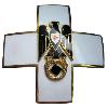 Hochovales, durchbrochen gearbeitetes Abzeichen aus versilberter Bronze. Auf der Rückseite eine senkrechte Anstecknadel. Auf dem Rand der Rückseite erhöht der Hersteller.