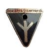 Hochovales, durchbrochen gearbeitetes Abzeichen aus Bronze. Auf der Rückseite eine senkrechte Anstecknadel. Auf dem Rand der Rückseite erhöht der Hersteller.