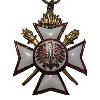 Leicht ovales, durchbrochenes Abzeichen aus verkupfertem und anschließend versilbertem Eisen. Hinten eine waagerechte Anstecknadel mit Sicherungsblech aus Messing.