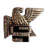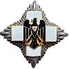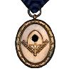 Längliches Kreuz aus vergoldeter Bronze. Die Kreuzarme sind gold bordiert und an den Enden nach innen geschweift. Zwischen den Kreuzarmen jeweils 5 goldene Strahlen. Die Vorderseite der Kreuzarme ist emailliert, mittig mit aufgesetztem runden, vergoldetem Mittelschild. Am oberen Kreuzarm eine breite mitgeprägte Öse durch die das Band gezogen ist.