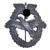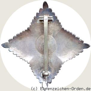 Vierstrahliger Bruststern aus Silber. Aufgelegt ein Silber vergoldetes und emailliertes Verdienstkreuz. Die Einzelstrahlen sind glatt mit einer Schnurumrandung. Zwischen den 4 Hauptstrahlen jeweils gleichmäßig abgestuft 13 Zwischenstrahlen. Die Rückseite leicht gewölbt und glatt. Senkrecht eine Anstecknadel mit Gegenhaken. Auf der Nadel der Hersteller.