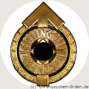 Abzeichen aus vergoldeter Bronze in Form eines stehenden Pfeils. Mittig auf dem Pfeil mitgeprägt ein runder breiter Ring. Eingeschlossen durch den Ring ein auf die Spitze gestelltes Hakenkreuz. In kleinem Abstand außen zum Ring ein stilisierter Lorbeerkranz der hinter dem Pfeil verläuft. Die Zwischenräume sind nicht durchbrochen und schwarz emailliert. Auf der Rückseite eine senkrechte Anstecknadel und der große Buchstabe – B – für Zweitstück sowie RZM und der Hersteller.