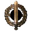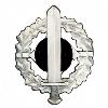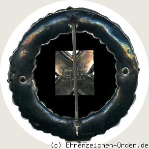 Rundes, durchbrochenes Abzeichen aus Silberblech. Auf der Vorderseite aufgelegt und mit dem Kranz vernietet ein Hakenkreuz. Hinten eine senkrechte Anstecknadel mit Gegenhaken. Hersteller auf der Rückseite.