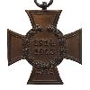 Versilbertes Kreuz aus Buntmetall. Die Kreuzarme, nach außen breiter werdend, haben einen breiten, 2 mal abgestuften und polierten Rand. Die Innenseiten der Kreuzarme sind fein gekörnt. Vorder- und Rückseite mit viereckigen mitgeprägtem Mittelschild. Zwischen den Kreuzarmen im Abstand ein umlaufender versilberter Eichenlaubkranz. Am oberen Kreuzarm eine angelötete gewöhnliche Öse mit Bandring.