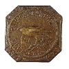 Rundes Abzeichen aus Buntmetall hohl geprägt. An den Rändern 4 mal 2 kleine Löcher, gleichmäßig verteilt, zum annähen.