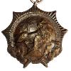 Runde Medaille aus dunkel gebeiztem Eisen ohne Rand. Oben eine mitgeprägte Öse mit kleinem Ring.