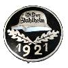 Vergoldetes Steckkreuz aus Bronze mit geschweiften Kreuzarmen. Die Kreuzarme sind weiß emailliert und golden bordiert. Rückseite mit senkrechter Anstecknadel mit Gegenhaken.