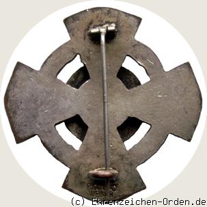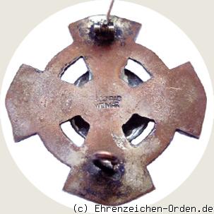Versilbertes Steckkreuz aus Bronze mit geschweiften Kreuzarmen. Die Kreuzarme sind weiß emailliert und silbern bordiert. Mittig auf der Vorderseite ein aufgelegtes, emailliertes Medaillon. Die Rückseite mit senkrechter Anstecknadel und Gegenhaken.