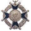 Versilbertes Steckkreuz aus Bronze mit geschweiften Kreuzarmen. Die Kreuzarme sind auf der Vorderseite silbern bordiert und weiß emailliert. Mittig aufgelegt ein rundes, emailliertes Medaillon. Die Rückseite mit senkrechter Anstecknadel mit Gegenhaken. In der Mitte die Herstellerangabe.
