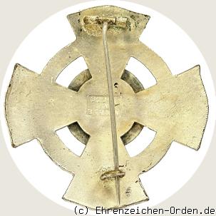 Versilbertes Steckkreuz aus Bronze mit geschweiften Kreuzarmen. Die Kreuzarme sind silbern bordiert und weiß emailliert. Auf der Vorderseite mittig ein aufgelegtes, rundes, emailliertes Medaillon. Die Rückseite mit senkrechter Anstecknadel und Gegenhaken. Herstellerbezeichnung auf der Rückseite.