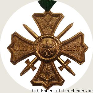 Vergoldetes, geprägtes Kreuz aus Buntmetall. Mittig auf Vorder- und Rückseite ein rundes Medaillon. Durch die Mitte 2 gekreuzte Schwerter. Die Kreuzarme an den Enden mit einer dreieckigen Ausbuchtung in der Mitte. Die Kreuzarme umgeben von einem erhöten geriffelten Rand. Die inneliegenden Flächen der Kreuzarme sind fein gekörnt. Oben eine angelötete Öse mit Bandring.