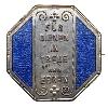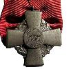 Achtspitziges Kreuz aus vergoldetem Silber. Die Kreuzarme mit schmalem rot, durchscheinend emailliertem Rand. Darunter ist eine Querschraffur zu sehen. Die Innenseiten sind weiß emailliert. Vorder- und Rückseite mit aufgelegtem runden Medaillon. Durch die Mitte gehen 2 gekreuzte goldene Fackeln. Zwischen den Spitzen des oberen Kreuzarmes eine Agraffe in Form von Flammen. Oben eine parallele Öse mit kleinem Ring und Bandring.