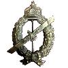 Versilbertes Kreuz aus Bronze mit leicht gebogenen Kreuzarmenden. Vorder-und Rückseite mit rundem Medaillon. Zwischen den Kreuzarmen Segmente mit Buchstaben. Am oberen Kreuzarm angefügt eine Öse mit kleinem Ring und Bandring. Auf der Öse die Herstellerbezeichnung H.Timm Berlin.