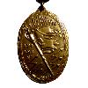 Hochovales Abzeichen aus vergoldetem Buntmetall. Die Vorderseite ist emailliert. Auf der Rückseite eine mit Plättchen aufgelötete, lange Anstecknadel.