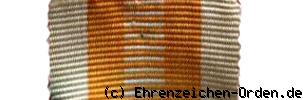 Versilbertes achtspitziges Kreuz aus Buntmetall mit aufgelegtem runden Mittelschild. Die Kreuzarme haben am Rand einen breiten schwarz emaillierten Rand. Dieser außen und innen silbern bordiert. Die Innenseiten der Kreuzarme sind goldgelb glasemailliert. Durchscheinend ist eine Punktierung erkennbar. Zwischen den Spitzen des oberen Kreuzarms eine mitgeprägte kleine Öse mit kleinem Ring und Bandring.