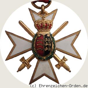 Achtspitziges Kreuz (Johanniterkreuz) aus vergoldetem Buntmetall mit weiß emaillierten Kreuzarmen auf der Vorderseite. Die Rückseite ohne emaillierte Kreuzarme. Diese mit erhöhten Rändern sind innen fein gekörnt. Vorder- und Rückseite mit aufgelegtem ovalem Mittelschild. Durch die Mitte zwei vergoldete, gekreuzte Schwerter. Am oberen Kreuzarm ein Segment mit kleinem Ring und Bandring.