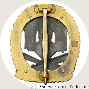 Durchbrochen gefertigtes Abzeichen aus vergoldetem und patiniertem Zink. Der Kranz vergoldet und die Auflagen patiniert. Unten auf dem Kranz ein viereckiges, vergoldetes Messingschild ( 8 x 6 mm) mit schwarzem Grund. Die Auflagen sind mittels 4 Nieten mit dem Rand verbunden. Auf der Rückseite eine senkrechte Anstecknadel. Auf dem Rand die Herstellermarke.