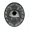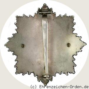 Steckorden in Form eines 8-straligen Sterns mit großem runden Mittelschild. Der Strahlenkranz ist grau-schwarz mit silbernen Spitzen der Strahlen. Die Rückseite mit senkrechter Anstecknadel.