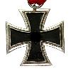 Kreuz aus verkupfertem Zink in Form eines 8-strahligen Strahlenkranzes. Mittig auf der Vorderseite ein aufgelegtes rundes Schild. Hinter dem Schild gekreuzt durch die Mitte 2 Schwerter. Diese überlagern die Strahlen. Der obere Strahl verlängert und hinten zu einer Öse geformt durch der der Bandring geht.